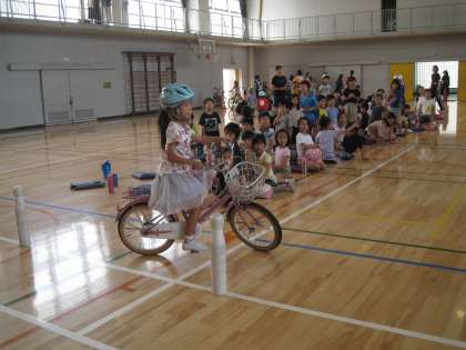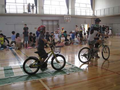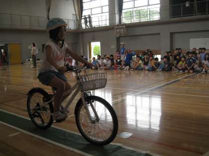 警察の方や校外委員さんにもご協力をいただきながら、3年生対象の自転車教室が開かれています。普段、自転車に乗ることはない体育館で、ヘルメットを装着してコースを走行しました。単にコースを走ることが目的ではなく、要所要所で停止したり、左右の安全確認を行うべきポイントが設けられていました。