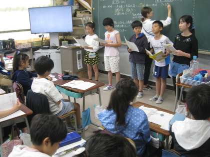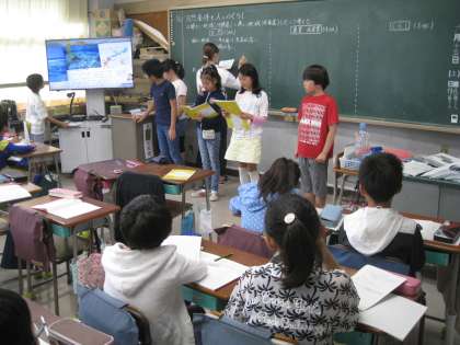 社会科「自然条件と人々のくらし」、北海道と沖縄の違いを観点別にグループ発表をしています。プレゼンが終わったあとの質疑応答や、思いを交流し合うことが、とても大切にされていました。