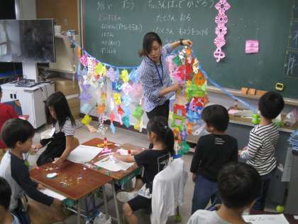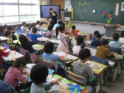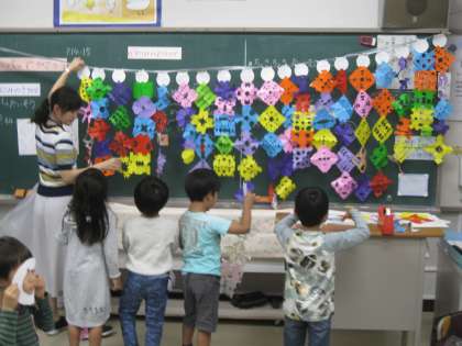 1年生はたまたま、図工「チョッキンパッでかざろう」の授業が同じ時間帯に重なり、それぞれの教室が仕上げた作品で彩られていました。子どもたちの明るさと、いいとこ勝負です!!