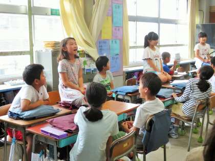 4年生は国語の学習で「じゅげむ」の発表会をしました。落語家の落語を観てイメージとやる気をふくらませました。発表会に向けて、国語の授業や毎日の音読の宿題で練習を重ねました。聞き手により場面を分かりやすく伝えるために、子どもたちは、登場人物や台詞によって読み方を変えたり、身振り手振りを入れたりしました。台詞を暗記して落語家になりきって、発表している姿を見て嬉しく思いました。