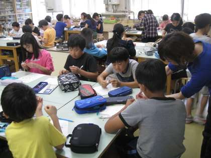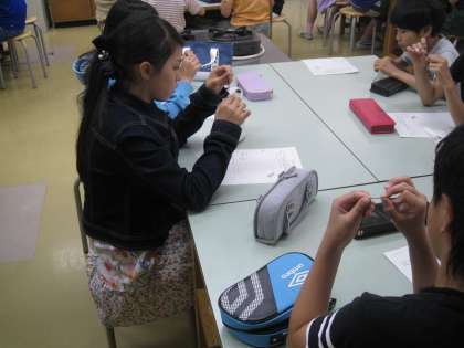 実物投影機による先生の示範から手順を学んだ5年生が、実際に糸を手に取り玉結び作りに挑戦しました。苦労している子もいたものの、先生がきめ細かくフォローしながら、巡回してくださっていたから安心です。