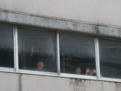 そのとき、体育館棟から何かを感じたのです。その方向へ目を移すと、2階の窓際に集まって、こちらに手を振っている子どもたちを発見。嬉しそうな顔! 顔! 顔!その無邪気さを見ると、こちらも笑顔と元気がチャージされる思いがします。はい、それだけのことです。でも、日記に書きたくなったひとコマだったのです。