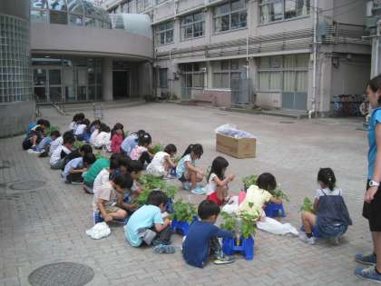 1年生が丹精込めて育てているあさがおが、青々と葉を茂らせ、一段と生長しています。支柱を立ててあげるタイミングを迎え、今日はその作業に取り組みました。