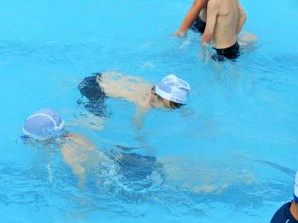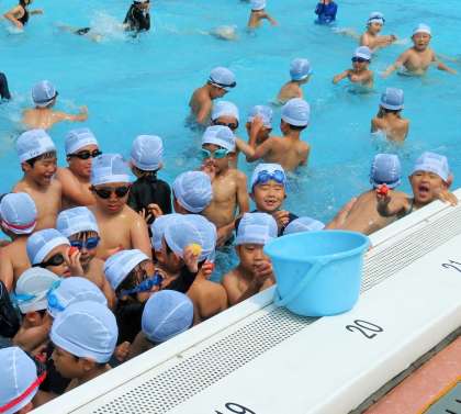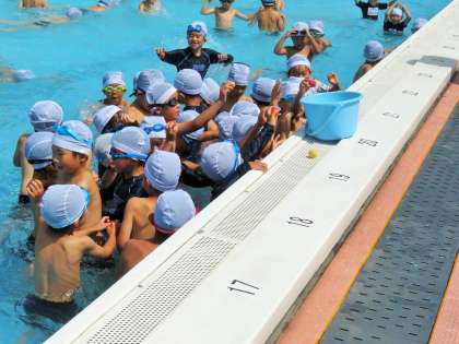 今日は絶好のプール日和です。1年生の水泳学習は、水に顔をつけたり、もぐったり、宝探しをしたりして、水に親しみました。水遊びの心得を守って、安全に気を付けて学習をしました。