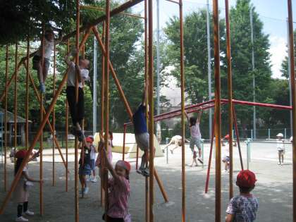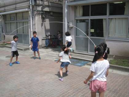 「プール、気持ちが良かったです」と1年生。水中が極楽だったということは、校庭は地獄? いえ、いえ、そんなことはありません。子どもたちにとっては、こんな暑い日でも外遊び天国なのです。