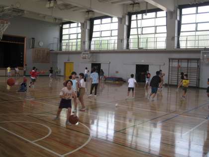 バスケに興じる子が多く見られました。先生も混じってシュート!