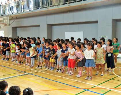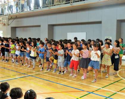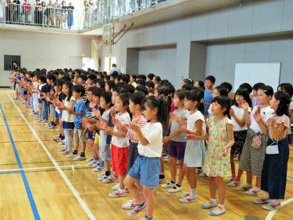 今日の音楽朝会は、2年生と5年生の発表です。2年生は「朝のリズム」と「誕生日って」の歌です。「朝のリズム」は、手拍子と足踏みなど、リズムをとりながら、「誕生日って」は、手話の振り付けをしながら、とってもかわいらしく歌っていました。