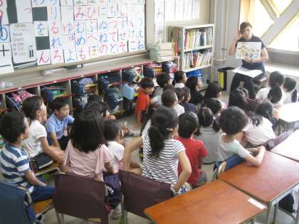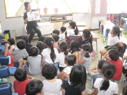 そして、先生の周りに集まり、紙芝居の絵を見ながら、どのような「ありがとう」が描かれているのか考えていきました。なんだか、とってもほのぼの。スーッと「ありがとう」の世界へ入っていかれそうな空気感が漂っていました。