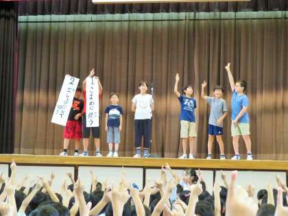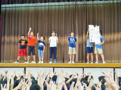 最後に、企画・代表委員会から「水はね、ピタッと週間」についての説明がありました。寸劇やクイズを織り交ぜながら、わかりやすく説明していました。水飲み場や手洗い場の使い方に気を付け、水がはねないようにしていきましょう。