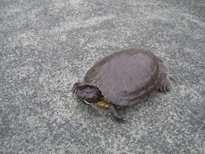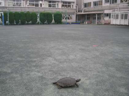 校庭のど真ん中を、カメさんがのんきにお散歩しています。蛇崩に暮らしているらしく、半月ばかり前にも登校してきた子どもたちが、「カメが校庭に入っています」と大騒ぎしたことがありました。