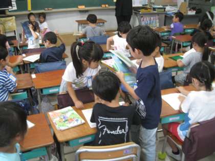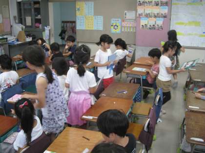 お手伝いが大好きな1年生、嬉しそうに配るお仕事をしています。先生が一人ひとりに配っていたら数分かかってしまいますが、みんなが出動したらあっという間にコンプリート! とっても合理的でもあります。