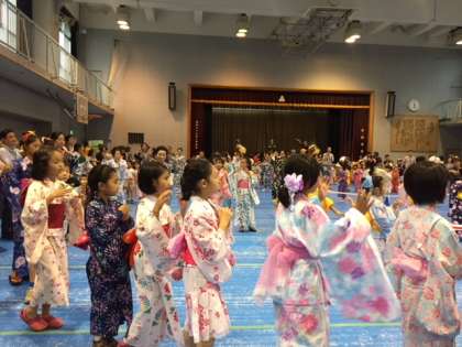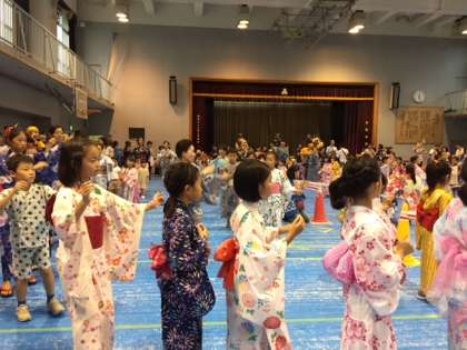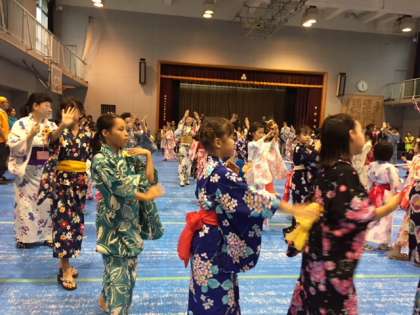 松丘子ども太鼓に合わせて盆踊りが始まりました。地域の方々に教えていただいた「炭坑節」などを踊りました。