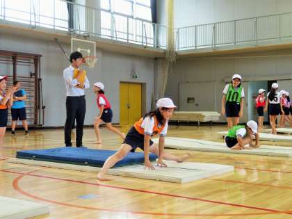 また、マット運動の苦手な子には、技能ポイントをどのように理解させるのか、自分のめあてをどのようにもたせるのか。そして、運動が楽しい、マット運動が楽しいと思う授業にするには、どうすればよいのか。井奥先生と研究員の先生方で考えた手立てで指導をし、子どもたちは一人ひとりの技能を向上させていました。