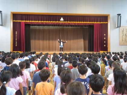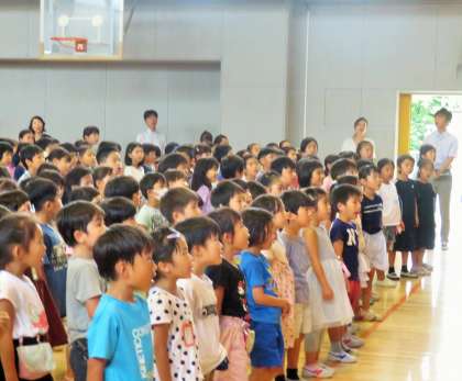 全校の子どもたちで校歌を歌いました。さわやかで元気な歌声が体育館に響きました。