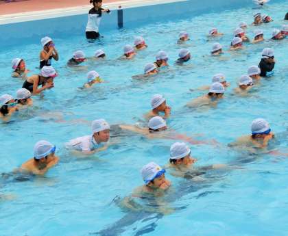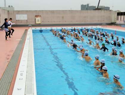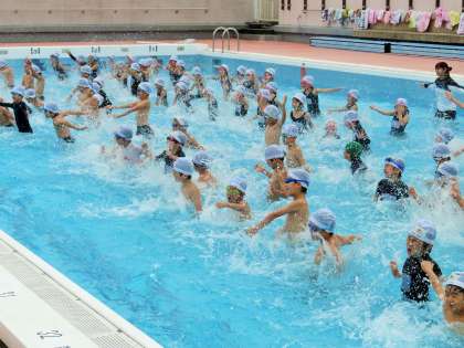 今日から夏季水泳教室が始まりました。初日は、低学年からの実施となりましたが、多くの子どもたちが練習に来ました。気温は26度と寒さを感じていましたが、プールの中に入ると「あったかい!」と歓声が上がりました。