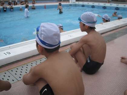 身体をプールの方へ向けて、体育座りをしている子が目にとまりました。何をしているのでしょうか。視線の先にあるのは、友達が泳ぐ姿です。け伸び、バタ足、一つ一つの練習メニューを見逃すことなく、お手本にしていこうとする姿勢が立派ですね。