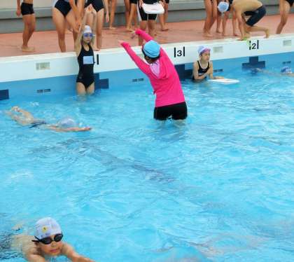 今日は夏季水泳教室3日目です。久しぶりに日差しが出て、気温も上がりプール日和になりました。プールの水はとっても気持ちがいいです。松丘小学校の指導教員が10名入っています。