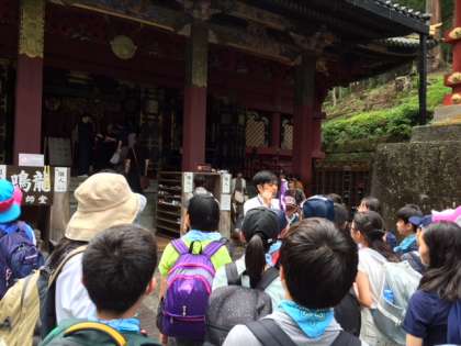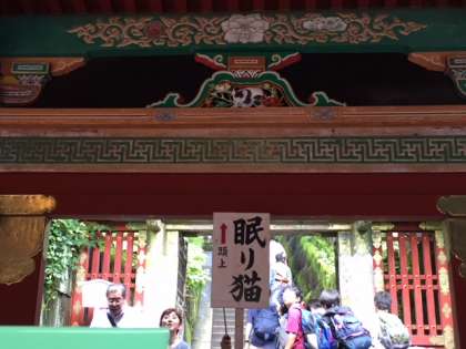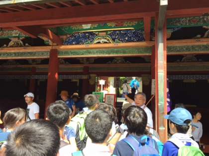 眠り猫の説明、そして鳴龍を見学しました。龍のお顔の下で拍子木を打つと、音が共鳴して、いつまでも鈴のような音が響き渡っていました。