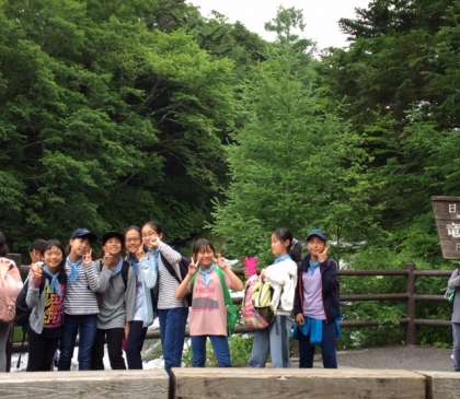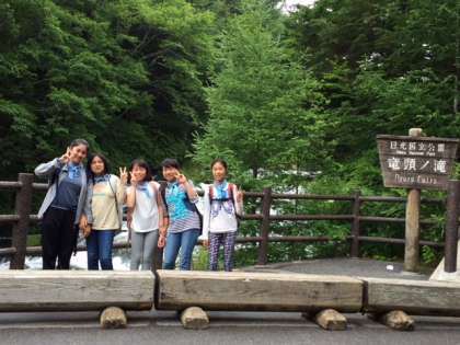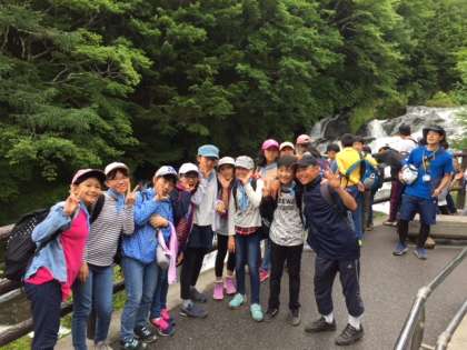 ハイキングのゴールは竜頭の滝です。長さ210mの急斜面を途中で二手に別れ、まるで大岩を噛むように豪快に流れ下っています。二手に分かれた滝を正面から見た姿が龍の頭に見立てたものと言われています。