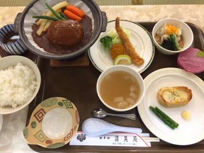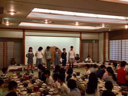 今日は洋食中心の夕食を食べました。みんな元気で食欲も旺盛です。この後は、キャンプファイアー風の室内レクをします。