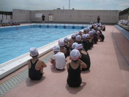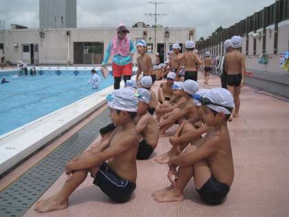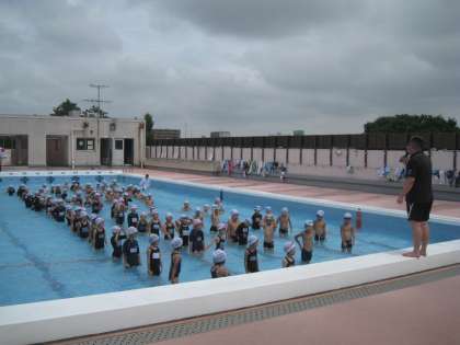 太陽も顔を出し始めた低学年の第二部、子どもたちを見た瞬間に得た印象は、待ちの姿勢の素晴らしさです。リズム泳を終えてプールサイドにあがっても、口を開いたり、だらけたりせず、きりっとした姿勢で先生の話を聞く態勢が崩れません。