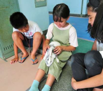 ウサギの「オセロ」と「ブラン」は大喜びです。飼育委員の皆さん、いつもありがとうございます!