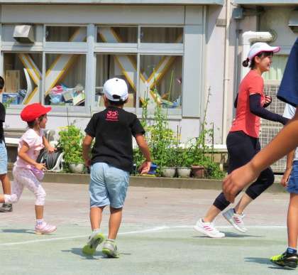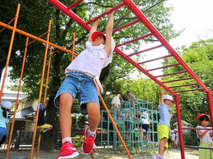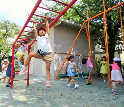 先生と一緒に鬼ごっこをしたり、固定遊具で遊んだりしています!