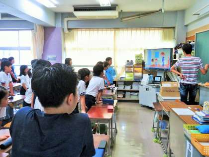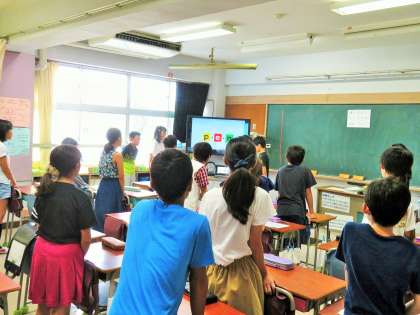 5・6年生は、新学習指導要領を先行実施して、年間70時間の英語に取り組んでいます。今朝は15分間のモジュール学習で、映像を見ながら楽しそうにアルファベットを発音していました。