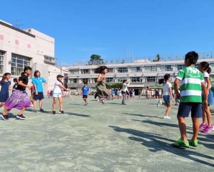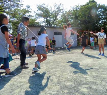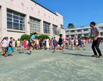 今日は、1・3・5年生の体育朝会です。長縄跳びは、学級のチームワークづくり、運動感覚づくりにはとてもよい運動種目なので全校で取り組みます。