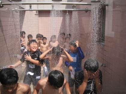 4年生がプール納めの日を迎えました。今日も相変わらずの残暑、朝から水が恋しくてたまらぬ子どもたちでした。とかく「冷たい、冷たい」の声を連発するシャワーも極楽、ある子は「こんなに気持ちがいいシャワーは初めて!」と、入水前からテンションが上がる一方でした。