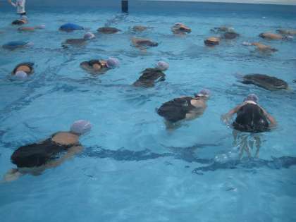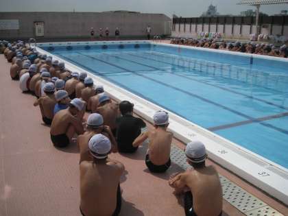 一人ひとりが前進し、無事に水泳指導を終えようとしていることをプール納めの式でお祝いしたあと、いよいよプールへと入りました。