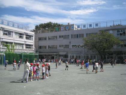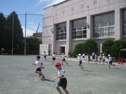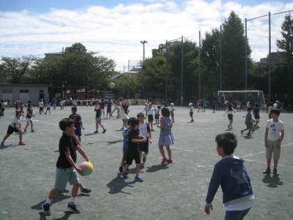 すがすがしいお天気の中休みです。校庭では大勢のお友達が遊んでいます。鬼ごっこ、ボール遊び、長縄を楽しむ子が一番多く見られました。とってもよい眺めです。