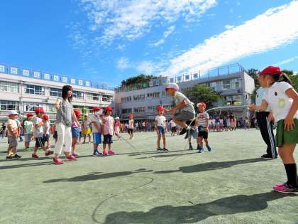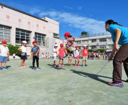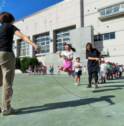 今日の体育朝会は、最後の長縄朝会です。前回から各学級は、休み時間にクラスの目標に向けて練習をしてきました。