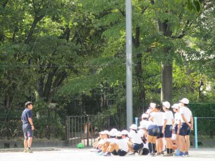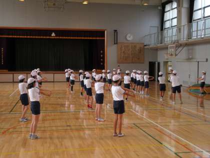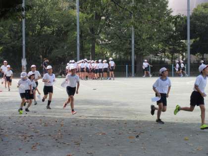 1校時は体育館と校庭で5年生の体育授業が行われています。学級数の多い本校ですから、3クラス同時展開は当たり前なのです。