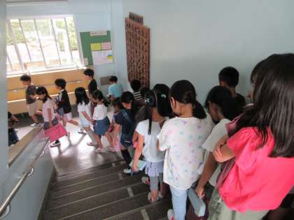 偶然、5年生が教室から理科室へと移動する現場に出会いました。おっ、なかなかいい感じ! けれども、ごく数人が口を開いてしまいました。途中、動きを止めて、先生が声掛けをしました。一発合格できなかったのは残念ですが、次回はきっとめあてを達成できると信じていますよ。