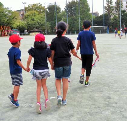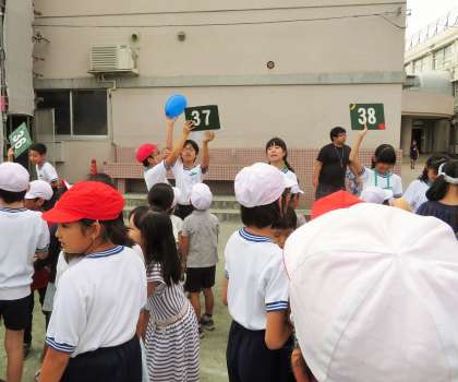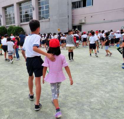まずは、班ごとに集合をします。一つの班に1年生から6年生までが入って縦割りの集団で遊びます。
