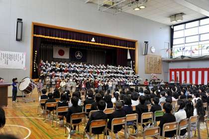 金管バンドの演奏で入場した134名の新1年生を迎え、松丘小学校の新しい1年が始まりました。2年生はこの日のために歓迎のことばと合奏「きらきら星変奏曲」を一生懸命練習して披露しました。