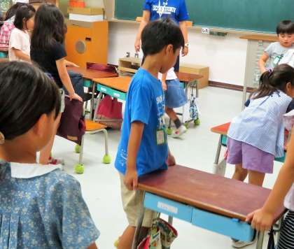 今日は初めての「自問清掃」です。自らに問いかけながら、3つの心を磨いています。(1.おしゃべりを我慢する心、2.自ら汚れているところを見つける心、3.困っている友達を助ける親切な心)