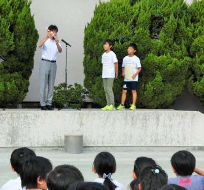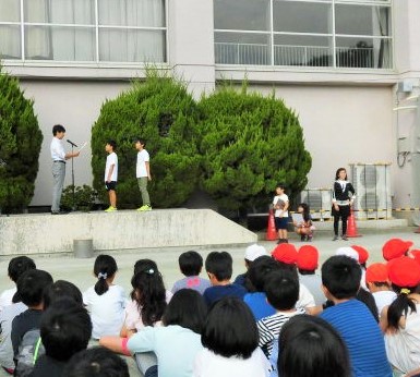 サッカークラブの表彰、そして給食委員会から「食べ残し0週間」の呼びかけがありました。