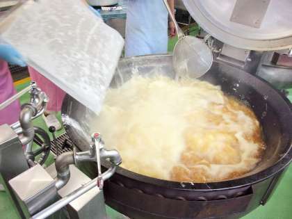 かつおの立田揚げは、学年ごとにサイズを変えて調理を行っています。