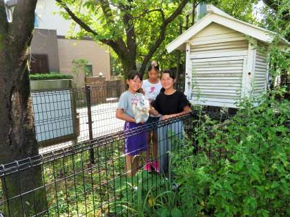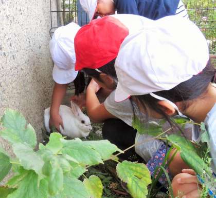 昼休みに飼育委員の子どもたちは、ウサギのお散歩をしてくれています。ウサギの「オセロ」と「ブラン」は大喜びです。子どもたちもウサギに触れたい子が集まっています。
