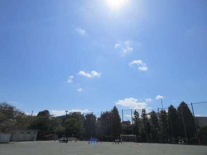 朝方の雨が嘘のように晴れ渡り、みるみるうちに水たまりが消えた校庭や犬走りでは、早速屋外活動が始っています。気温は急上昇しているものの、風があるのが救いです。