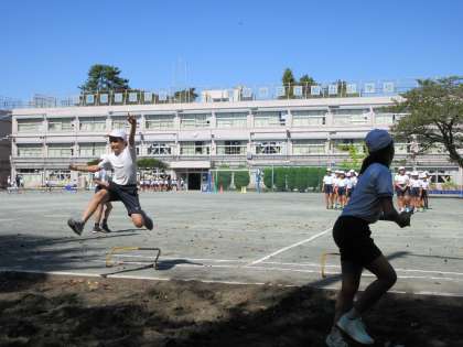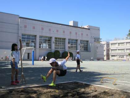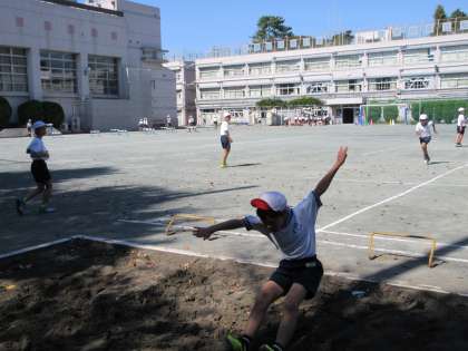 5年生が走り幅跳びに取り組んでいます。みんな全力で臨んでいるから、見ていてすごく爽やかです。