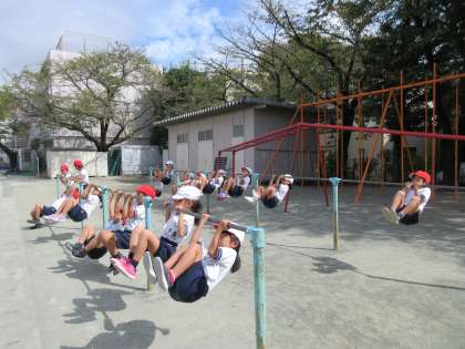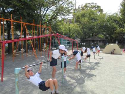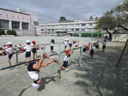 ダンゴムシ、コウモリ、お布団など、色々なものに2年生が変身した姿を見せてくれています。それも地上ではなく、鉄棒を握ったり、脚でぶら下がったりしている状態で。