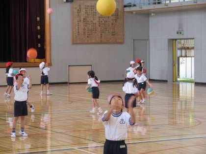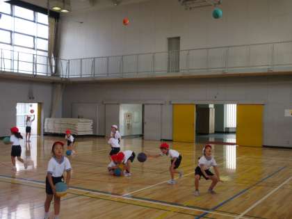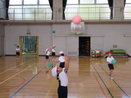 両手でボールを真上に投げ上げる動きが、だいぶ上手になってきた1年生です。天井につきそうな投球をする子も現れています。