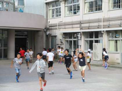 意気揚々と校庭へ出て来る子どもたちがいっぱいです。