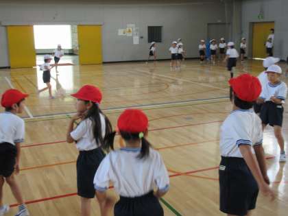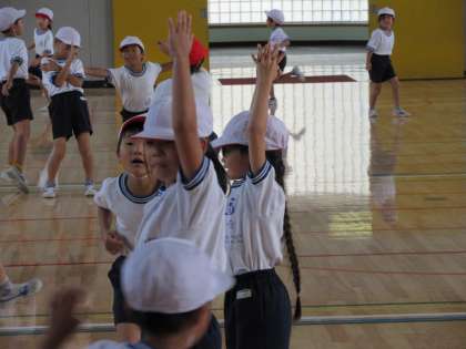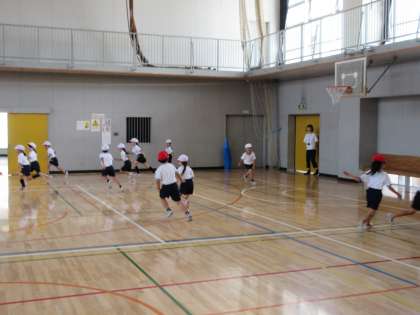 赤い帽子の子が鬼です。タッチされた子は、両手を挙げて、助けを待ちます。追いかけたり、追いかけられたりする動き以外に、周囲を見渡し、仲間を助ける気持ちや行動が必要となる鬼遊びなのです。
