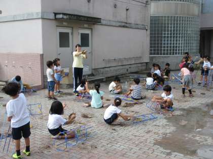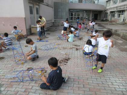 丹精込めて育てて来たあさがおのお世話もついに終盤を迎えています。支柱に巻き付いているつるを取り外し、リースへと生まれ変わらせる作業を1年生が行っていました。