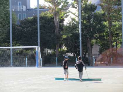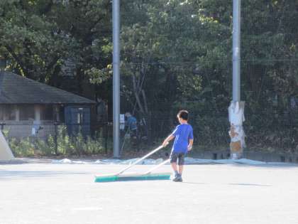後期の運動委員さんが、校庭のブラシかけを行っています。高学年の活躍のおかげで、1校時、外体育のクラスから気持ちよく活動を始められますね。
