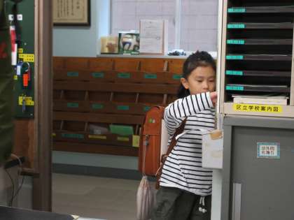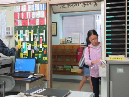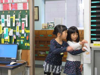 きちんと名乗り、自分のクラスのカードを職員室から持って行く、係や当番の子どもたちです。目と目を合わせて、コミュニケーションできている子もいます。